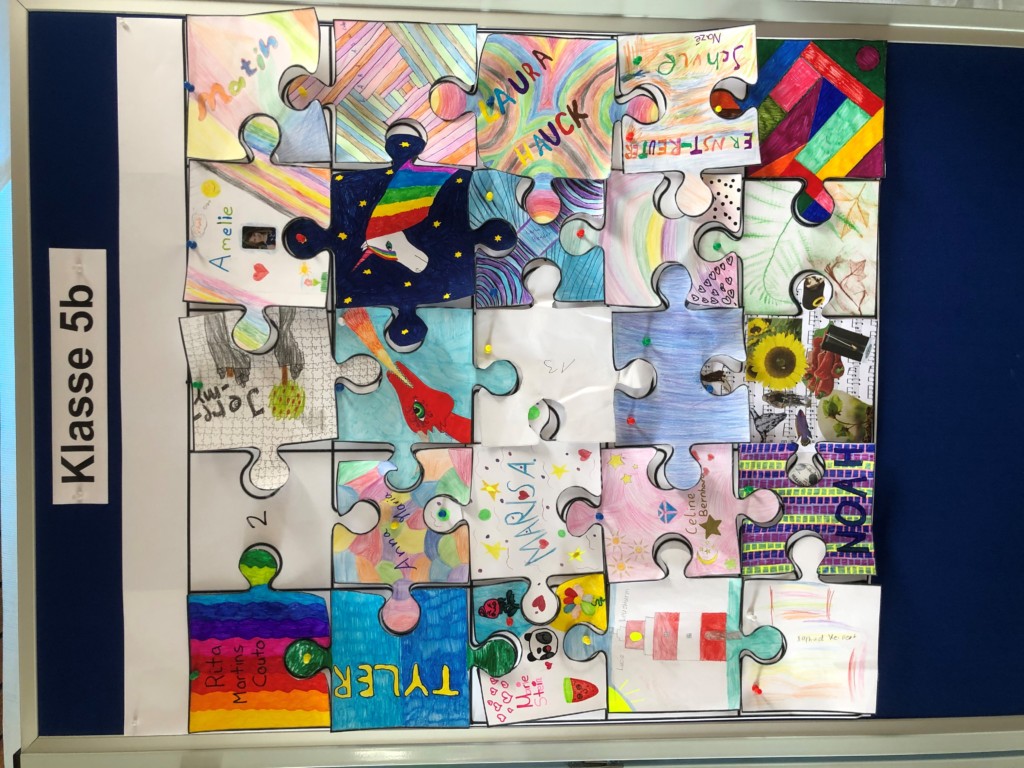 Jedes Kind der neuen fünften Klassen erhielt im Vorfeld ein weißes Puzzleteil, dass es zur Aufnahmefeier individuell gestaltet mitbringen und zusammen mit allen anderen Kinder der Klasse zu einem großen bunten und vielfältigen Kunstwerk zusammenfügen durfte.