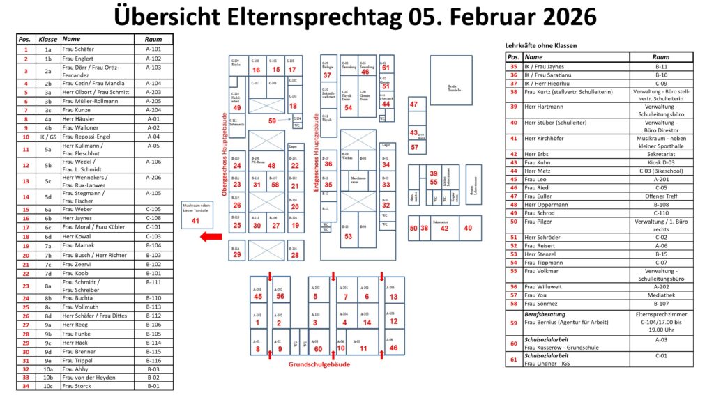 Die Klassenlehrkräfte sind während des Elternsprechtages in ihren Klassenräumen, die Fachlehrkräfte in verschiedenen Fach- und Nebenräumen erreichbar. Alle wichtigen Hinweise hierfür entnehmen Sie bitte den Aushängen im Schulgebäude oder folgender Abbildung (hier auch als pdf-Download: KLICK):