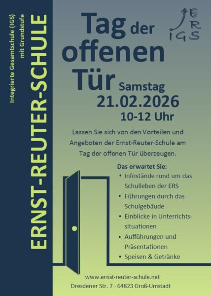 Die Ernst-Reuter-Schule öffnet am 21. Februar 2026 ihre Pforten und lädt zu ihrem „Tag der offenen Tür“ ein. Von 10 bis 12 Uhr sind an diesem Samstag alle Interessierten, Schülerinnen und Schüler sowie Eltern herzlich willkommen, die Ernst-Reuter-Schule in der Dresdener Straße 7 in Groß-Umstadt kennen zu lernen. Alle Schulformen, die in der Ernst-Reuter-Schule angeboten werden stellen ihre Arbeit vor. Die Schulleitung steht für Fragen und Auskünfte persönlich zur Verfügung. An Ständen im Eingangsbereich u. a. von der Schulleitung, des Fördervereins und des Ganztagbereichs u.v.m., kann man nützliche Informationen über das Leben und Arbeiten in der seit 2014 inklusiv arbeitenden Integrierten Gesamtschule (IGS) bekommen. Außerdem werden Führungen durch das Schulgebäude sowie Einblicke in Unterrichtssituationen angeboten.